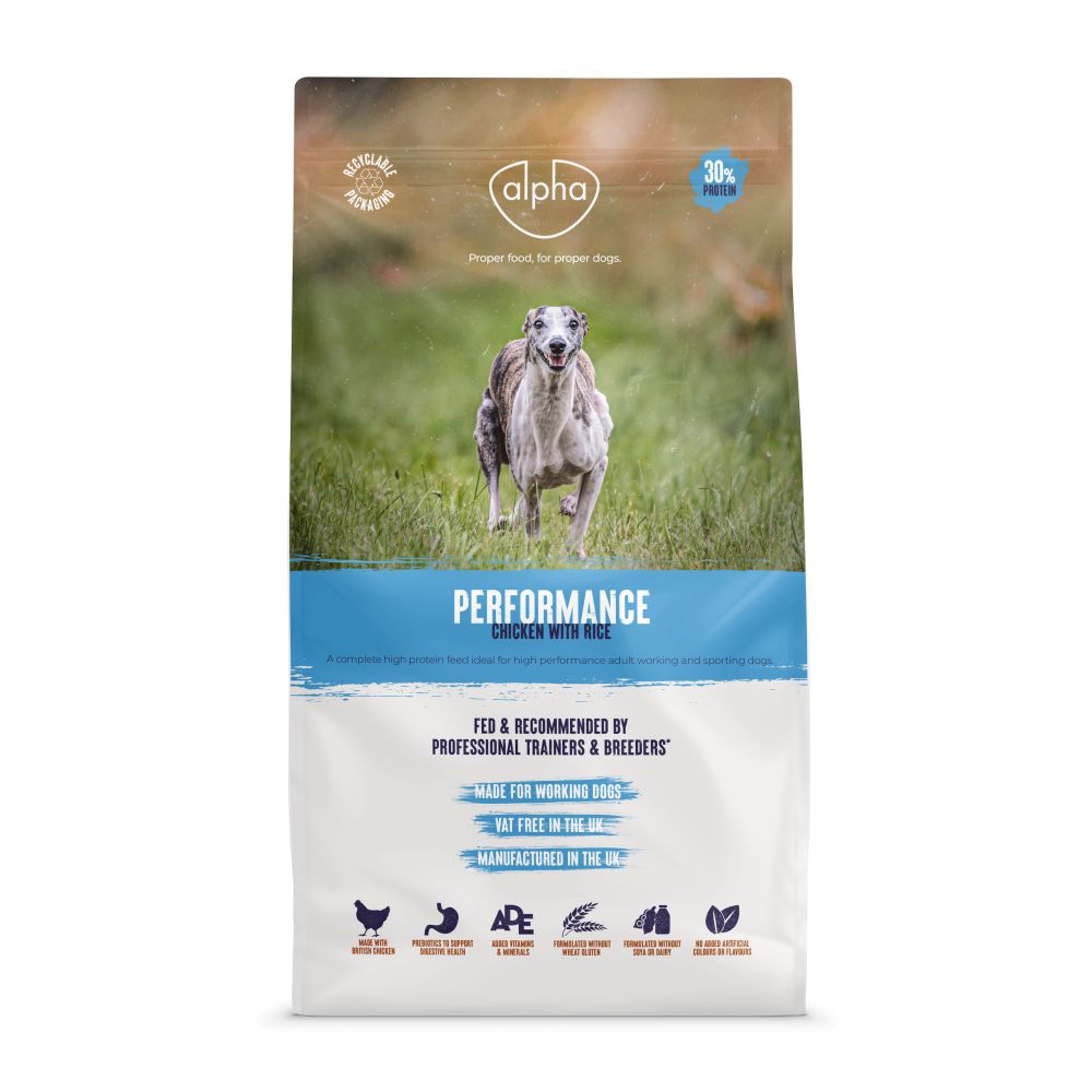 Max Endurance, Max Strength. Alpha Performance is formulated to support speed, endurance and strength in your racing and working dogs. Alpha Performance is formulated without wheat gluten and has been designed to support speed, endurance, and strength in working and sporting dogs. Poultry Meal (35.0%), Whole Maize, White Rice (14.0%), Poultry Oil, Sugar Beet Pellets, Whole Oats, Meat and Bone Meal, Brewers Yeast, Whole Linseed, Chicory Root Extract (as a source of Prebiotic FOS) (0.1%), Mannan-oligosaccharides (Prebiotic MOS) (0.3%), Extract of Yucca Schidigera. Analytical Constituents: