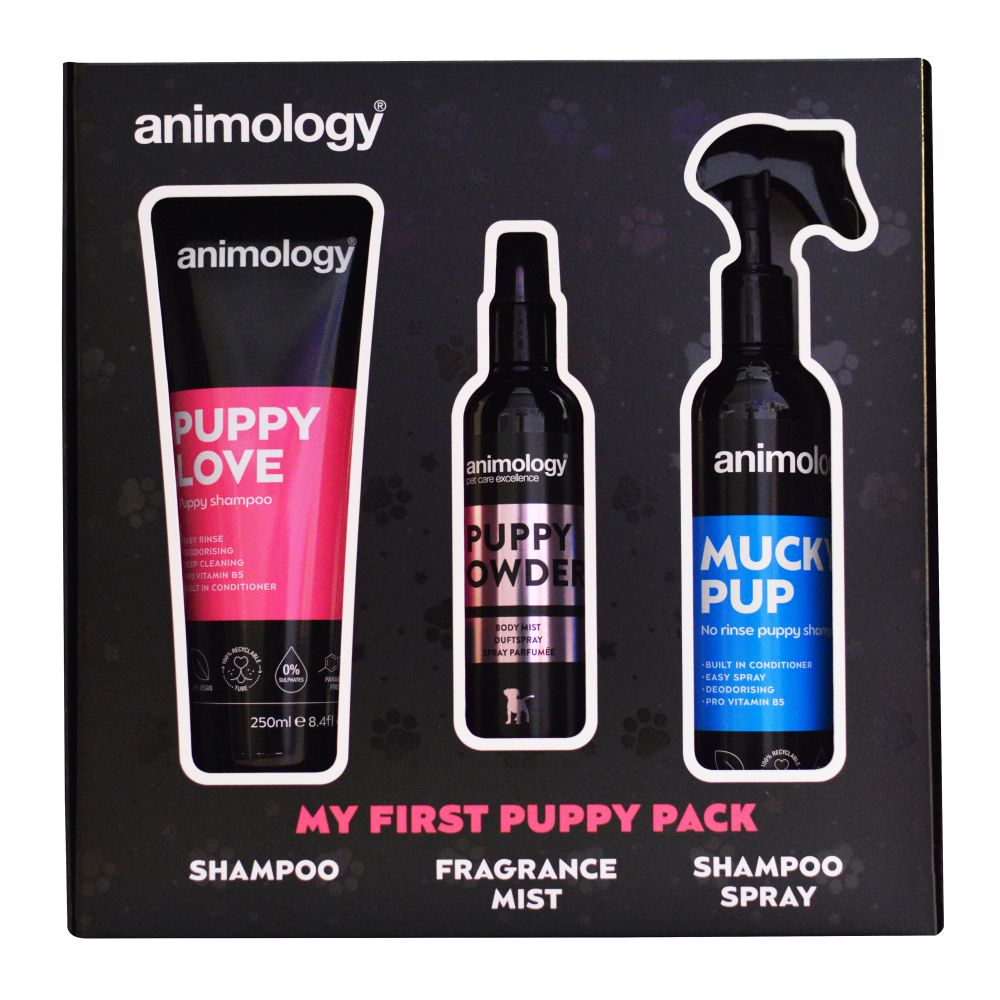 Thoughtfully curated to make your puppy’s early grooming experience extra special, My First Puppy Pack is the perfect combination of Animology grooming products to welcome your new fur baby into the family and introduce them to a lifetime of pampering and coat care. Our Puppy Love Shampoo is a soft and gentle formulation, perfect for keeping your puppy’s young coat soft, fresh and in optimum condition. For when time is short and a quick spruce up is required, Mucky Pup No Rinse Shampoo Spray provides a quick and easy solution, with no need for water. Finally, our Puppy Powder Fragrance Mist is ideal for applying a boost of Baby Powder Fragrance to your puppy’s coat, making cuddle time even more irresistible!