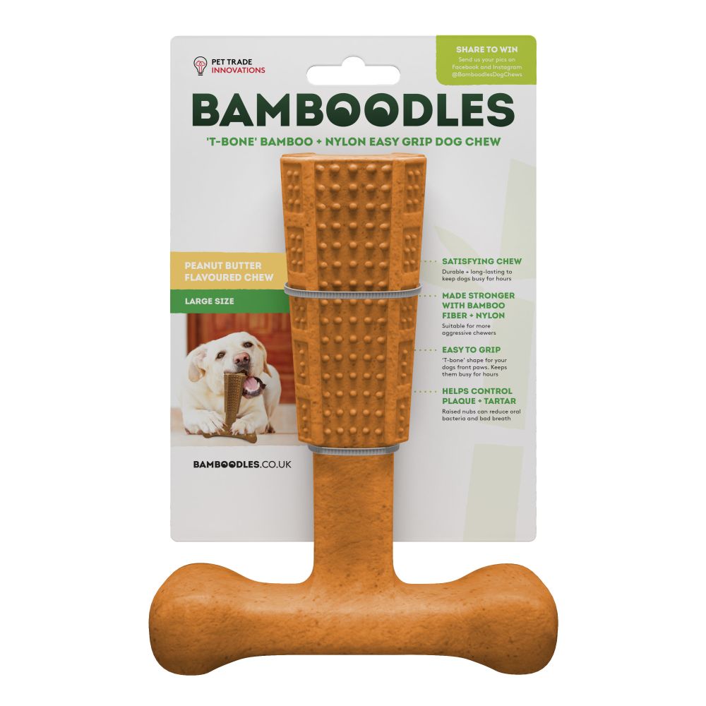 Bamboodles T Peanut Butter Flavour Large Dog Chew Toy Bamboodles T-Bone shaped chew toys are infused with bamboo making them durable and a challenge for even the most aggressive of chewers. The strong Peanut Butter smell will be the first thing you and your dog notice. EASY TO GRIP ‘T-bone’ shape for your dogs front paws. Keeps them busy for hours. HELPS CONTROL PLAQUE + TARTAR Raised nubs can reduce oral bacteria and bad breath. OCCUPY YOUR DOG Discourage destructive chewing.