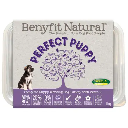 Puppy Working Dog Complete Raw Food – 80% meat, bone and offal, 19% Vegetables & 1% flax seed oil, kelp, herbs & Verm-X. Premium raw dog food lovingly prepared by Benyfit Natural. A truly satisfying and healthy meal to ensure your very best friend gets all the nutrients they need to grow into a happy, healthy dog. Results in visible signs of healthy skin, teeth and gums, glossy coat, better digestion and strong bones. Verm-X – As well as the natural and effective control of intestinal hygiene, the herbal ingredients in Verm-X formulation provide vitamins, minerals and trace elements that contribute to overall health and wellbeing. Using this product alongside regular worm counts may lessen the need for regular chemical worming. Human Grade British Ingredients: Turkey with bone, Ox Liver, Ox Kidney, Ox Heart, Broccoli, Carrot, Swede, Verm-X, Flaxseed Oil, Kelp, Celery Seeds, Alfalfa, Nettles, Psyllium Husks, Clivers and Wild Yam. Feeding guide: Puppies should be fed 8-10% of their body weight up to 4 months; 6-8% up to 6 months; 4-6% up to 8 months; 3-4% up to 12 months. Adjust portions accordingly. Every working dog is different. Wash your hands, utensils and surfaces after handling any raw meat.