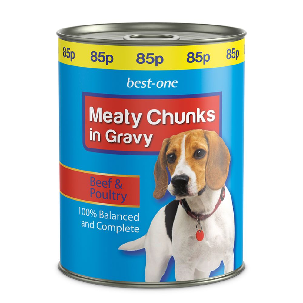 Chunks in gravy with Beef & Poultry. A complete pet food for dogs. Composition: Meat and animal derivatives (4% beef, 4% poultry), cereals, derivatives of vegetable origin, minerals. Analytical Constituents: