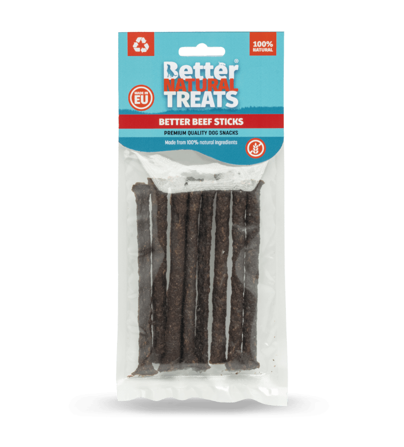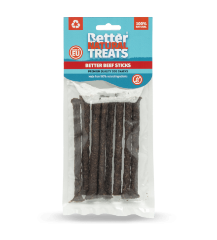Made from finest cuts of Beef. These succulent and delicious treats are made using 100% Beef, no by-products. 100% natural treats. These yummy sticks of Beef, can be given for good behaviour and are perfect size for use as training rewards for any dog. High in protein-grain and gluten free make this a Better Natural Treat, with no artificial flavours or colouring. Suitable for puppies from 12 weeks.