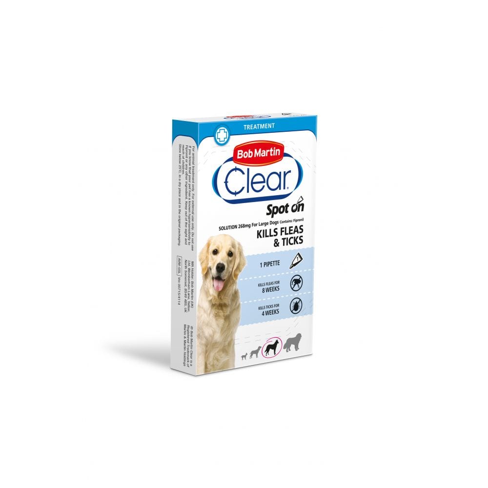 **CONTAINS FIPRONIL – THE SAME ACTIVE INGREDIENT AS FRONTLINE!** Bob Martin FleaClear Spot On Solution for dogs is for killing fleas and ticks on your dog. Applied at the back of the neck and between the shoulders, each treatment provides protection against fleas for up to 8 weeks and protects from ticks by up to 4 weeks. Kills fleas and is clinically proven to be effective in 48 hours. This product does not prevent ticks from attaching to dogs but will kill ticks within 48 hours. Bob Martin FleaClear Spot On can be used on dogs over 2 months old and is suitable for use in homes with both cats and dogs. Regular treatment of all cats and dogs in the home with effective flea killing products together with regular vacuuming of your pet’s bedding and resting areas is needed to protect your pet and home from fleas. If there is an existing and heavy infestation in the home it may also be necessary to treat the home with an approved home flea product.