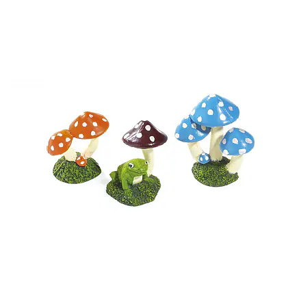 Classic Pet Products range of polyresin aquarium ornaments is unsurpassed in terms of intricate attention to detail, each ornament is hand made and hand painted (using non-toxic paints), and this range has become the universally recognised market-leader. These fun spotted Mushroom ornaments come in 3 colours,Orange, Blue and Purple with a friendly frog adorning the single mushroom. Ideal for younger aquarists and suitable for smaller tanks and fish bowls; these ornaments add a fairytale, fun element to any aquatic scene. Overall size appx L 70 x W 55 x H 70 mm.