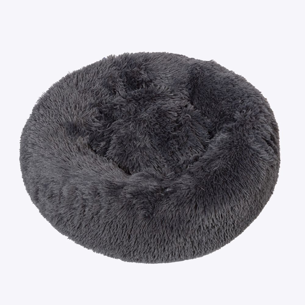 A cosy and calm donut shaped bed. Made with supersoft fabric. Machine washable. Soft polyester fibre filling. The supersoft long pile fabrics in these Danish Essentials fluffy donuts are super cosy and the donut shaped bed creates a calm space for your pet. Available in beige, charcoal and silver.