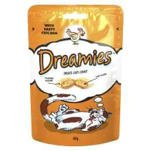DREAMIES Cat Treats with Chicken 60g Cat treats that are crunchy on the outside and soft inside Delicious DREAMIES biscuit with a chicken filling your cat will love With just 2 calories in each biscuit this is a great treat for your cat up to twice a day (8-10 treats per serving) Our cat treats are served in a convenient pouch that you and your cat will love Free from artificial colours and flavours These irresistible little crunchy squares are the perfect cat treat filled with delicious soft centres that cats dream about. DREAMIES are a range of cat treats that your cat will crave. They come in 7 varieties, Chicken, Salmon, Beef, Cheese, Tuna, Turkey and Duck that your cat can enjoy up to 20 pieces a day. Just shake the Dreamies pouch and watch your cat come running.