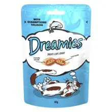 DREAMIES Cat Treats with Salmon 60g Treats cats crave Crunchy outside, soft inside Only 2 calories in every treat! Shake the pouch and watch your cat come running! Cats dream about the little crunchy squares filled with a delicious soft centre… …And what’s even better is there are only 2 calories in every treat!