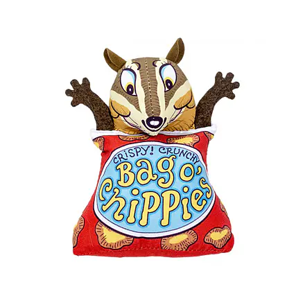 Bag O’ Chippies Cat Toy From fluffy’s snack bar: A little something for everyone’s playful palate. Our toys are the perfect nosh, even for the most persnickety critic. Cooked up with just the right balance of drool-inducing organic catnip and tail-twitching crunch, your cat will no doubt become a satisfied customer in short order. This little bag of munchie goodness packs a crunchy punch and is just right for dippin’ n’ flippin’. From the first bite, your kitty will be chomping chippies ’til the doggies come home. May contain nuts (kidding). Non-toxic printed poly fabric with felt accents, fiberfill, and organic catnip. Collect all Three! Grilled Hamster & Cheese, Bag O’ Chippies, and Mice Tea!