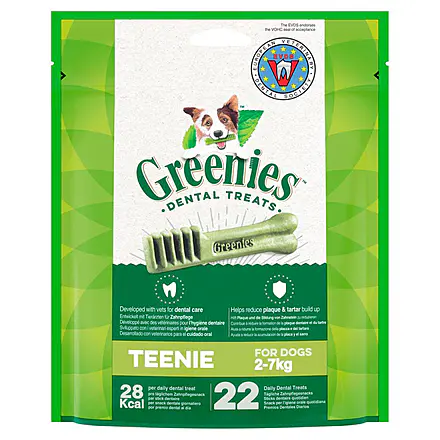 GREENIES Teenie Daily Dog Dental Treats 85g (22 Chews) made for dog sizes 2-7kg. KEY FEATURES GREENIES dog dental treats have a unique, delightfully chewy texture that helps reduce plaque and tartar build up while freshening breath. 100% nutritionally complete and made with soluble ingredients that easily break down for safe and easy digestion. 28 calories per daily dental treat. Teenie size offers the most appropriate sized chews for dog sizes 2-7kg. The European Veterinary Dental Society (EVDS) endorses the Veterinary Oral Health Care (VOHC) seal of acceptance. INGREDIENTS Cereals, derivatives of vegetable origin, meat and animal derivatives, minerals, yeasts, fruit, various sugars, oils and fats. FEEDING GUIDE For dogs of 2 – 7 kg, feed 1 GREENIES chew per day. Not suitable for dogs under 2 kg or puppies under the age of 6 months. As with any edible product, monitor your dog to ensure the product is chewed adequately. Swallowing any item whole can be harmful or even fatal to a dog. Use within 4 weeks of opening. Fresh drinking water should always be available.