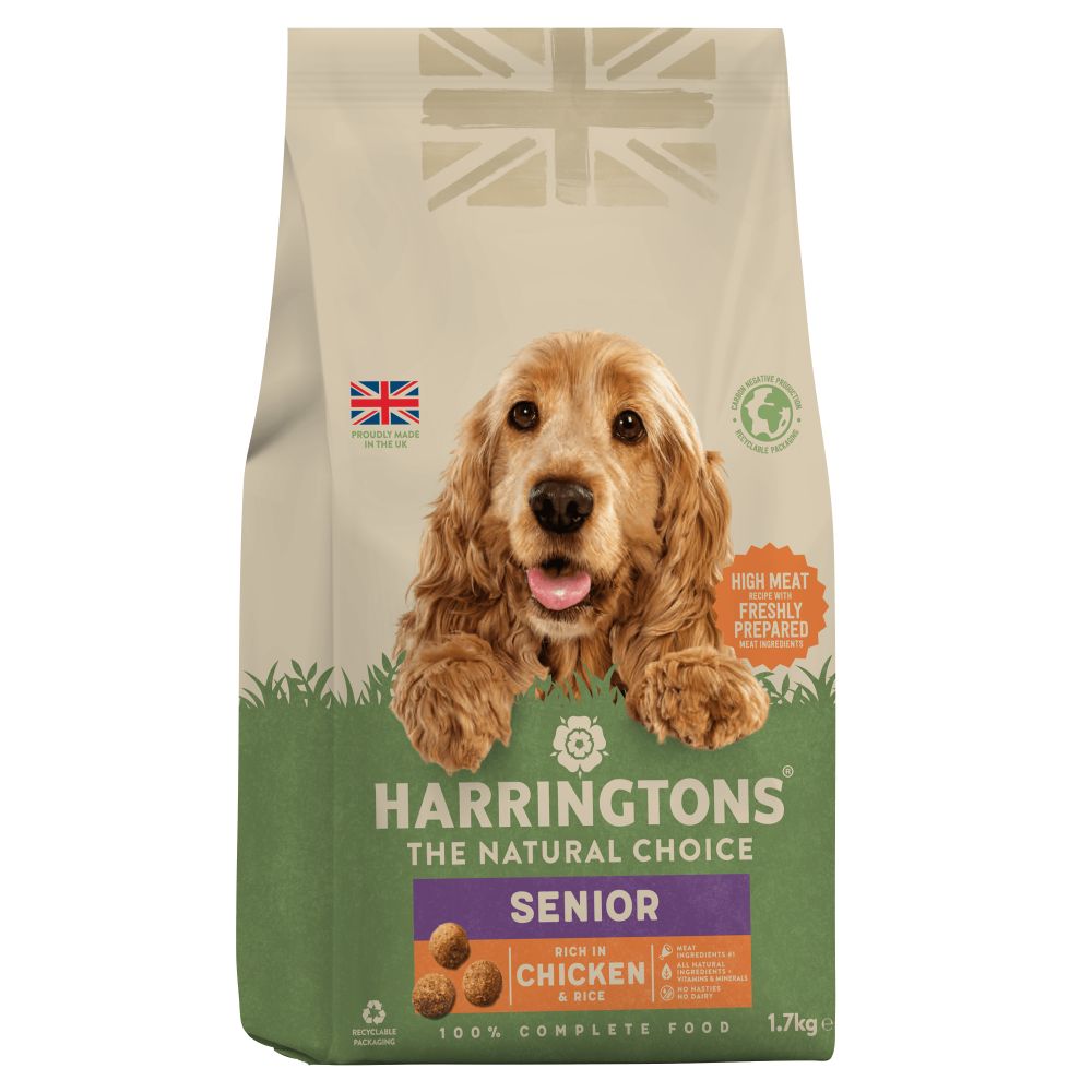 “Our recipe includes more freshly prepared meat ingredients than ever before as a great source of natural protein for energy, growth & repair and meat ingredients come #1 in our recipe. With added benefits for older, less active dogs including glucosamine & chondroitin blend to help support joint structure and movement, and 25% less fat than our standard Harringtons adult recipe. We’ve added a delicious homemade chicken gravy to both the inside & outside of our kibble to make our recipe even tastier, and also omega 6 & 3 in the form of salmon oil to support a healthy immune system. Additional benefits from ingredients such as seaweed to support oral hygiene & provide a natural source of vitamins, minerals & trace elements, vitamin E to help support a healthy immune system, and prebiotic FOS to help maintain a healthy digestion. From the UK’s first carbon negative pet food company.”.