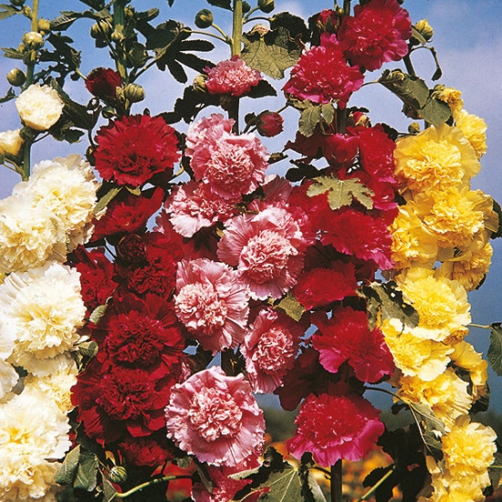 A real cottage garden plant with tall strong stems with bright green foliage lined with double flowers in shades from yellow and white to purple and red.