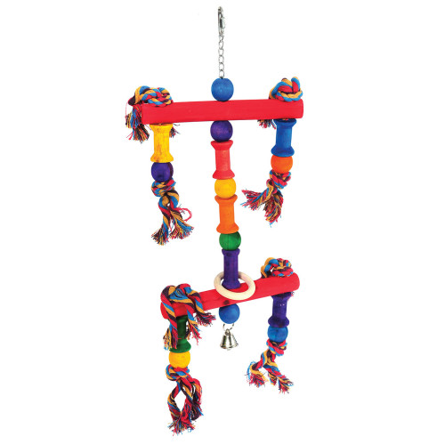 This brightly coloured bird toy is recommended for parrots and larger birds.