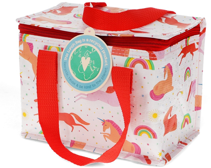 A charming insulated lunch bag in pink, adorned with vibrant unicorns, stars and rainbows.