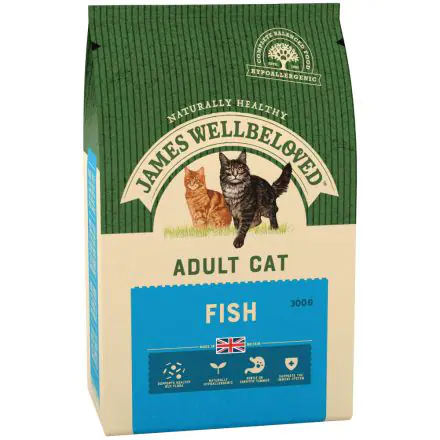 Carefully crafted and nutritionally balanced complete dry cat food for the health and wellbeing of adult cats from 12 months to 7 years. Using all our knowledge and experience, we’ve created James Wellbeloved Fish Adult. We take a handful of ingredients from nature, one source of animal protein and combine them with all the vitamins and minerals your cat needs. And all the great taste it deserves. For added peace of mind, it’s naturally hypoallergenic so less likely to cause an adverse food reaction and you will never see any added artificial colours, flavours or preservatives. Not now, not ever.