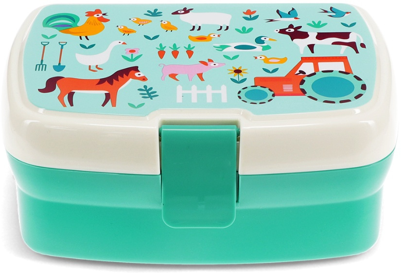 This fun lunch box has a removable tray and hinged lid featuring a colourful variety of farmyard animals and other things found on the farm.