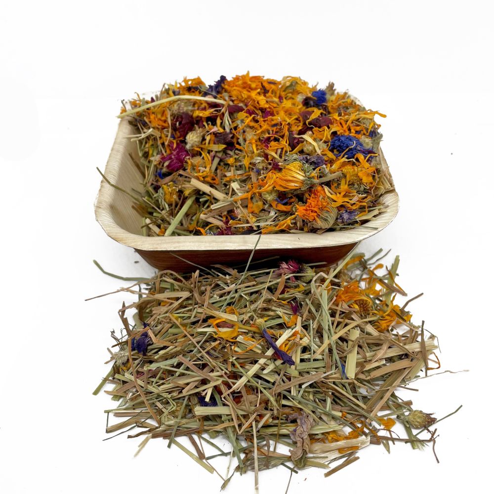 Complementary feed for Rabbits, Guinea Pigs, Hamsters, Mice, Gerbils & Rats Palm Leaf Bowl, Dried Timothy Hay, Dried Grass, Marigold Flowers, Hibiscus Flowers, Rose Flowers, Cornflowers, Blue Mallow Flowers. Feeding Guide: Feed as sold (remove clear film), place bowl into the enclosure, bowl is palm leaf & fully edible.