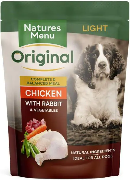 Our Light pouches have a lower fat content that our standard pouches, and are suitable for less active dogs and those who need to lose weight. Natures Menu recommends you have regular check-ups at your vet to monitor your dog?s weight accurately.