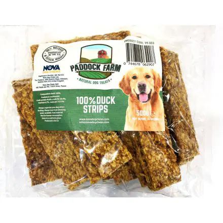 100% natural Duck Strips in 500g packs from the Nova Dog Chews Paddock Farm range. SIngle protein, all natural treats. Easy to break up and use as a training treat.