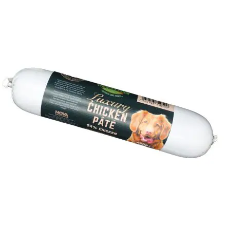 Paddock Farm Luxury Chicken Pate 400g. Single source protein, 94% meat with rice flour and vitamins and minerals. 100% natural product. Can be frozen and used as a treat for dogs.