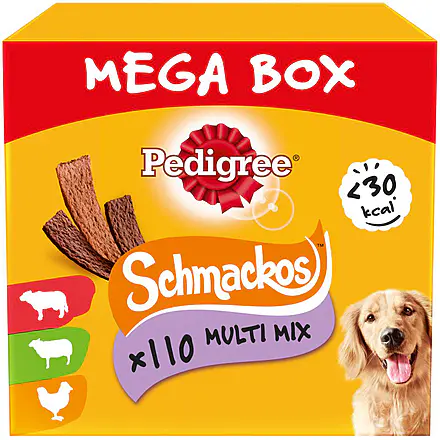 PEDIGREE dog food feeds the good dogs brings to our lives with delicious dog treats, oral care dog chews, & 100% complete main meals for all dogs. Carefully developed with our nutritionists & veterinarians at The WALTHAM Centre. Delicious Tender Strips – PEDIGREE SCHMACKOS treats for dogs are soft, succulent treats, full of delicious flavours that dogs adore. 110 tasty dog treat strips in beef & Lamb flavours. Features: – Chewy dog treats with less than 30 kcal / treat – Dog training treats with omega 6 to help keep them fit for life – Dog treats for training with vitamin E to help support natural defences – Treats for dogs with minerals including calcium to help keep bones strong – Beef dog treats and lamb dog treats with no artificial colours or flavours *Omega 6 to help keep them fit for life *Vitamin E to help support natural defences *Calcium to help keep bones strong Ingredients Meat and Animal Derivatives (total 40%, including 11% Poultry, 22% Beef and 5% Lamb) Derivatives of Vegetable Origin Cereals Minerals Various Sugars Oils and Fats.