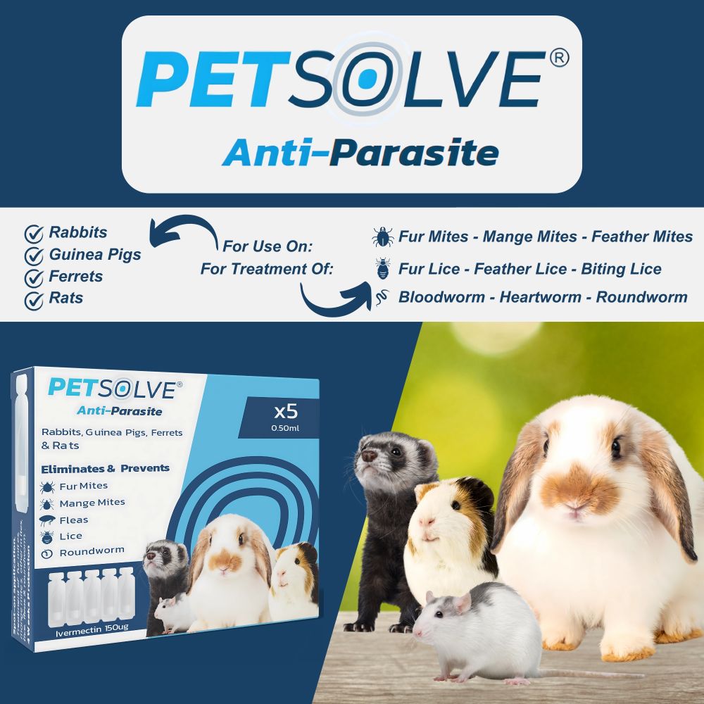 This product is a set of 5 Spot-On Anti-Parasite treatments that are designed to protect your pets from parasites. These treatments are suitable for rabbits, guinea pigs, ferrets, and rats. The product is easy to use and can be applied directly to the skin of your pet. The Spot-On Anti-Parasite treatment is an effective way to prevent and treat parasites in your pets. It is a spot-on solution that is easy to apply and can be used on a regular basis to keep your pets healthy and free from parasites. The product is safe for your pets and does not cause any harm or discomfort. The benefits of using Spot-On Anti-Parasite for rabbits, guinea pigs, ferrets, and rats are that it can help prevent and treat parasites in these animals. The product is easy to use and can be applied directly to the skin of your pet. It is a spot-on solution that is safe for your pets and does not cause any harm or discomfort. Each pipette give 4 weeks protection against parasites, while treating and eradicating current infestations. Treatment & Preventative For: Fleas Fur Mites – Mange Mites – Other Mites – Lice – Biting Lice – Other Lice