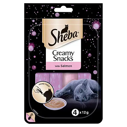 SHEBA Features Available in Chicken, Salmon and Beef Each 12g sachet has the ideal size for one daily portion Each sachet contains less than 10% of recommended calorie intake of cats Each 12g sachet SHEBA Creamy Snacks contains less than 3% fat No artificial colourants or additives.