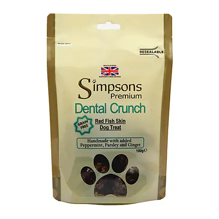 Our natural Dental Crunch red fish skin treats are completely grain free and made from natural, wholesome ingredients. With added Peppermint, Parsley and Ginger to help freshen breath and aid digestion. Handmade in the UK to our own bespoke recipe and formed in a unique bone shape making them easy to break.