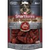SmartBones BBQ Beef T-Bones are irresistibly delicious rawhide-free chews withBarbecue flavour and tasty beef. In combination with their unique shape of a T-BoneSteak the BBQ Beef T-Bones look and smell like real barbecue meat your dog can notresist. Reward your dog while feeding SmartBones BBQ Beef T-Bones which are vitaminand mineral enriched, low in fat and easy to digest. The SmartBones BBQ Beef T-Bones are made for all size dogs.