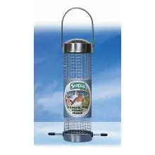 Constructed from 1/4″ square stainless steel mesh tube approx 2.5″ diameter x 12″ / 30cm length. Stainless Steel base & cap fittings. The all stainless steel construction helps keep squirrels at bay. Capacity approx 500g Peanuts.