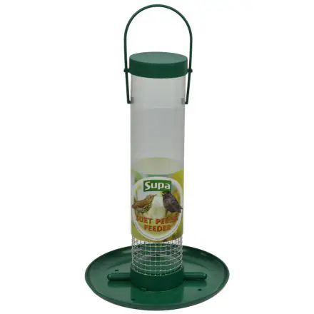 This feeder is designed so that the birds can feed from the wire mesh section whilst the larger plastic reservoir ensures that food is kept dry until required. This feeder is made in the UK.