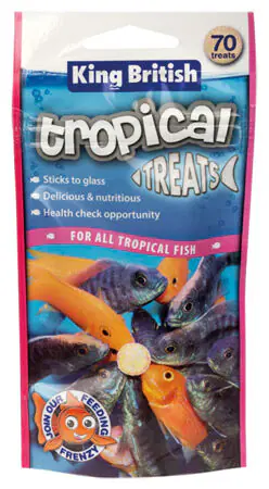 King British Tropical Treats are fun and healthy treats suitable for all tropical fish. We happily give our pet dogs, cats, rabbits, or hamsters treats, and it should be no surprise that our fish will also react well to treats! The treats are compressed discs of tropical fish food that will stick to the glass of your aquarium and attract the fish to feed. Children will love the spectacular “feeding frenzy” which can ensue, which will often bring even the shyest fish to the front of the tank.