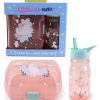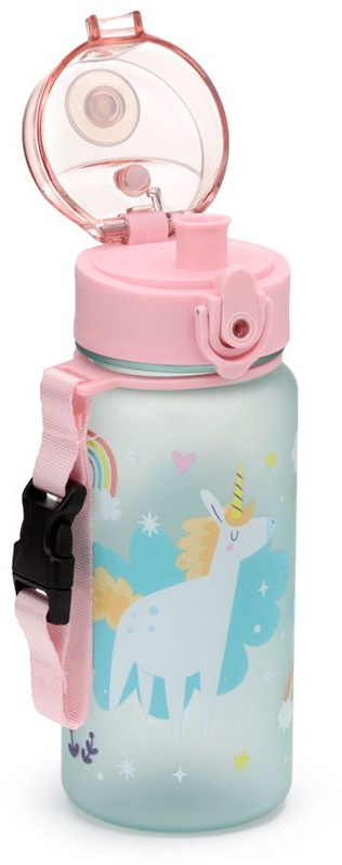 A children’s water bottle decorated with unicorn illustrations, a pop top lid and a pink carry strap. Great for encouraging a child to drink more, whilst being a stylish accessory!