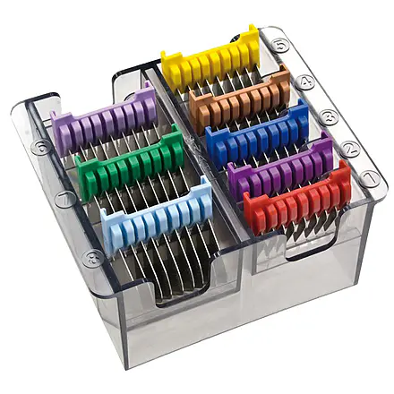 Stainless steel comb set. Designed to fit Creativa, Arco and Bravura blades. Cutting lengths 3mm – 25mm. Kit Contents: 8 attachment combs (3mm, 6mm, 10mm, 13mm, 16mm, 19mm, 22mm, & 25mm).